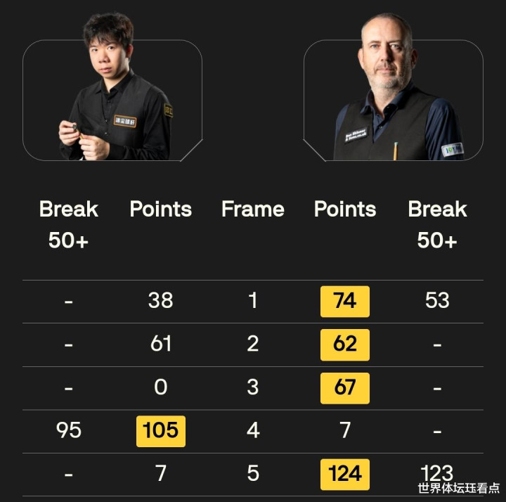 同时间段结束的其他比赛中,三届世界冠军马克威廉姆斯凭借单杆打出58分、123分的表现连胜三局以4-1轻取中国小将雷佩凡完成晋级。
