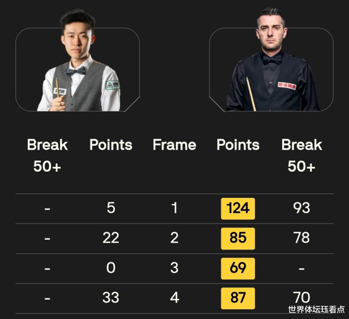 在塞尔比和常冰玉的比赛中,塞尔比用出色的表现完成了横扫。首局比赛中,塞尔比单杆打出93分的表现以124:5先胜一局成功取得1-0的领先。
