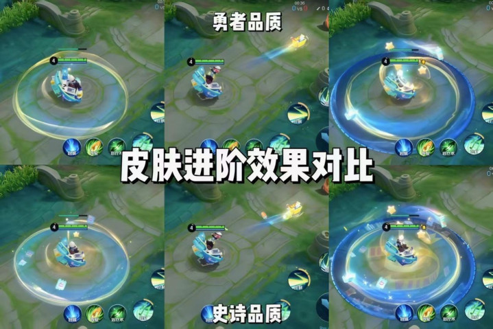 首先,一技能特效,勇者品质仅有黄色的波纹圆圈以及内部的渐变透明绿色,而进阶后的史诗品质则在此基础上,增加了粒子光效,以及便利纸张的元素旋转动效;二技能,勇者品质为一辆购物车飞射而出,尾部有蓝黄色拖尾效果,进阶后的史诗品质在此基础上,拖尾上加入了一些蓝绿色的物品图标;三技能,勇者品质是两只牛奶盒在旋转,大招范围是蓝色的光圈,头顶有三个黄色五角星,进阶后的史诗品质,则在此基础上加入了大招范围的超值促销的图标,同时圆圈范围也加入了一些星星元素和光纹,当然还有不少的粒子特效做点缀。