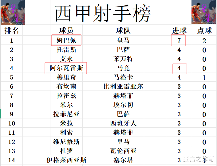 射手榜方面,姆巴佩6轮7球继续领跑,阿尔瓦雷斯今天上演帽子戏法后,追上托雷斯,艾永,穆里奇等人4球并列第2。拉菲尼亚,维尼修斯,杜罗,伊格莱西亚斯等人3球挤入前十。