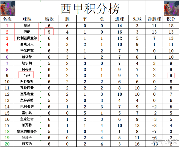 积分榜方面,皇马继续全胜领跑,巴萨少赛一轮落后5分,比利亚雷亚尔净胜球劣势排在巴萨之后。马竞逆转绝杀赢球后,近5轮保持不败,只不过他们平局太多,暂时只是升至第9。