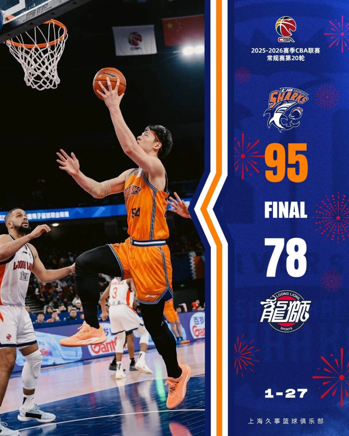 虎扑01月27日讯据上海男篮发文,2026年1月27日,2025-2026赛季CBA联赛常规赛第20轮,上海久事95-78广州朗肽海本。本场比赛,我鲨派出了古德温、李弘权、张镇麟、刘礼嘉、怀特塞德的首发阵容。
