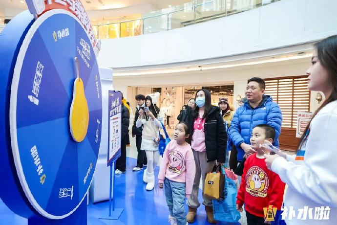 在长春站活动现场,蓝色主调的展区布置得格外亮眼——巨型瓶装造型装置吸睛十足,工作人员们身着统一服饰热情引导,消费者在试饮台品尝清润雪梨味新品,现场的留言墙贴满了手写祝福便签,互动转盘前还排起了队,大人小孩都兴致勃勃地参与游戏,整个商场里都洋溢着热闹的打卡氛围。
