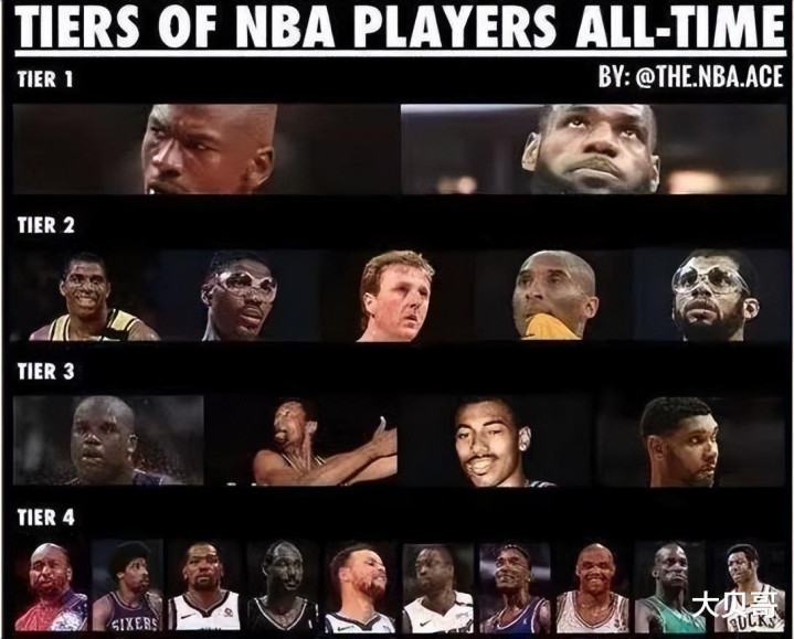 这一档就是Goat级别了,乔丹和詹姆斯上榜了,他俩进入这一档估计很多球迷早就猜到了,一个是历史上影响力最大的球员,一个是现役影响力最大的球员,两人的FMVP数量历史前二,乔丹10届得分王历史最多,詹姆斯历史总得分。话说到这,大家对于这次美媒的分档有什么想说的?欢迎留言讨论。
